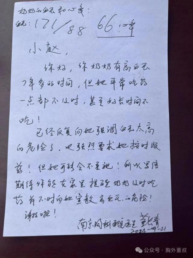 一位75歲奶奶,有高血壓十余年,診斷出來后,就一直有藥,但通常只是在頭暈的厲害時,才想起來吃顆藥。結果現場測量血壓達到171/88mmHg,而她一個人在家和十歲的孫女生活,我立馬讓她服藥去了,并且寫了一封信給她孫女讓她敦促奶奶服藥;