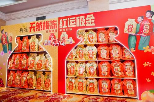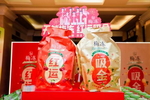 梅凍是溜溜梅填補高端果凍市場的力作,也是本次CNY爆品發布會上的“主打產品”。為了滿足消費者對新年的美好愿景,溜溜梅重磅研發金口味和紅口味兩種混合口味梅凍。其中,紅口味梅凍主要以紅梅、紅提、紅櫻桃秋冬紅色水果為原料,打造出紅梅紅提紅櫻桃+果漿果凍;金口味梅凍則是以金桂、金柚、金錢橘為原料,打造金桂金柚金錢橘+果漿果凍。兩款產品都可圈可點,不僅口感上層次分明、果香馥郁,還延續了梅凍“天然梅凍·鮮果生榨”的超高標準,是符合大家期待的健康零食;更有梅凍“紅運吸金”大禮包,年節時購買還可以獲得“紅運”“吸金”樣式的紅包與手提袋,精美實用的周邊好禮,再添新春氛圍感。