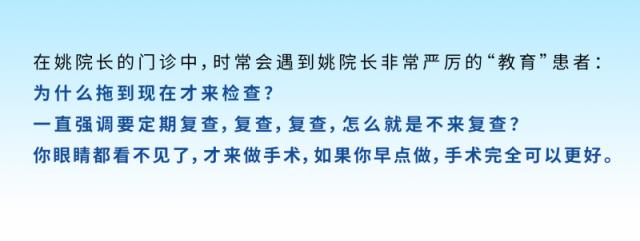 姚院長提到,很多患者會覺得沒有出現嚴重的癥狀就不用來檢查,而且覺得眼病是小病。但是很多時候,很多的病拖一拖會導致各種并發癥,就算做了手術,也已經錯過了合適的手術時機,很難達到理想的診療效果。特別是對于有高血壓、糖尿病等基礎疾病的患者更要引起重視。她表示只有及時發現并治療眼部疾病才能避免病情惡化導致視力喪失等嚴重后果。同時她也強調了預防的重要性,提倡“治未病”的理念。