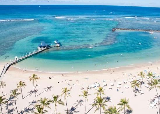 威基基海灘(waikiki beach)的精華部分是從麗晶飯店到亞斯頓威基基海濱飯店之間的一段,這里有細軟潔白的沙灘、搖曳多姿的椰子樹以及林立的高樓大廈,總長度約三四百米。這一段海水寧靜開闊,是一家老小假日休閑的理想地點。