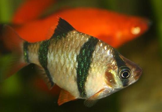 虎皮魚(學(xué)名:Puntius tetrazona)是鯉科、無須魮屬魚類。體長4-6厘米,體高,側(cè)扁略呈卵圓形;⑵~體色基調(diào)為淺黃色,帶有紅色斑紋和小點(diǎn),從頭至尾有4條垂直的黑色條紋,第一條豎紋通過眼部,第二條在腮蓋與背鰭之間,第三條起于背鰭末端直達(dá)臀鰭起點(diǎn),第四條在尾鰭基部,斑斕似虎皮,因而得名虎皮魚。