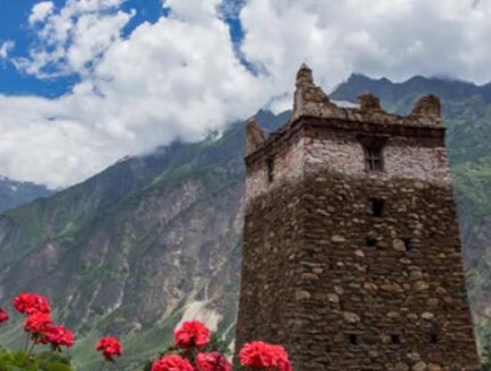 村子坐落在一條溝谷之中,建在兩條小溪之間的狹長臺地上,依山傍水而立。該村的所有建筑均由原木筑成,以外觀很古樸的小木楞屋為標志,具有歐式村寨的特色。房屋是清一色的尖頂木楞屋,墻體和頂棚用整根原木壘砌、拼接而成,頂部再用木板支撐成“人”字形的尖頂,可防雨防雪,以保證住房的安全。頂棚和屋頂之間形成兩頭通風的尖閣,是儲藏飼料和風干肉品的好地方。屋內家家戶戶都好像是工藝品陳列館,炕上鋪著花氈,墻上掛著刺繡的帳幔壁毯,地中央為精制的火爐。在落日的傍晚和霧氣的清晨,炊煙裊裊飄蕩,牛羊滿坡,整個村落構繪出了一幅人與自然和諧共處的山水畫。山村的西北遙對中國與哈薩克斯坦國界河,南面是高山密林。秋季一到,山村是五彩的紅、黃、綠、褐色,層林盡染,猶如一塊調色板,加之映襯阿勒泰山的皚皚雪峰,一年四季都是一幅完美的油畫。