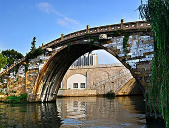 2002年11月蘇州重建覓渡橋。新覓渡橋位于古橋南側約60米處,全長337.4米,其中橋西側跨徑127米,東側跨徑151.4米,主橋凈跨28米,高8米。新橋總寬36米,除車行道、人行道外,還設有專用人行道,以方便人們上下橋觀景、散步,設計最高通航水位為2.12米(黃海高程)。2003年6月竣工通車。