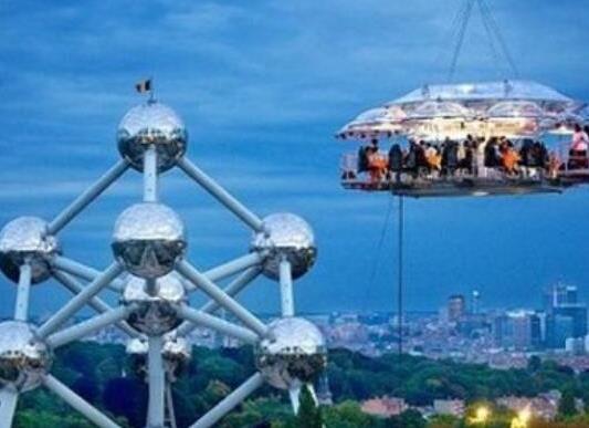 比利時(shí)空中餐廳位于比利時(shí)的首都布魯塞爾,餐廳重6噸,被一臺(tái)120噸的巨型起重機(jī)吊在50米的高空中,餐廳每次只能接待22名顧客,盡管就餐價(jià)格不菲,但仍然憑借其獨(dú)特的就餐體驗(yàn)而吸引著眾多的美食愛(ài)好者。