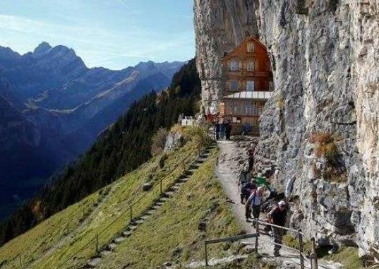 瑞士懸崖餐廳的奇特之處在于它是完全建在懸崖上的,它的后墻就是懸崖本身的巖石,這家餐廳只能通過(guò)乘坐纜車到達(dá),在乘纜車后還需要徒步經(jīng)過(guò)一些陡峭的山路。