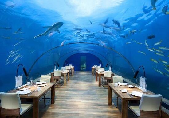 Ithaa是世界上第一家全玻璃的海底餐廳,造價(jià)500萬(wàn)美元,建在印度洋海底5米處的一個(gè)珊瑚礁上。穿過(guò)木制的走道,然后再往下走幾步臺(tái)階,你就會(huì)看見(jiàn)6個(gè)餐桌,每個(gè)餐桌只能坐兩個(gè)人。有幸在此享受大餐的人們,可以透過(guò)玻璃觀賞外面的熱帶魚(yú)和珊瑚礁。人們?cè)诶锩嬗貌,就好像置身于魚(yú)缸內(nèi),而魚(yú)在外面往里看。因此,顧客在餐廳品嘗美味時(shí)可以盡情觀賞繽紛絢麗的海洋世界。當(dāng)顏色鮮艷的成群珊瑚魚(yú)緊貼著四壁通透的餐廳游過(guò)時(shí),顧客們都會(huì)情不自禁地發(fā)出贊嘆聲。在這樣優(yōu)美的環(huán)境中就餐花費(fèi)自然不菲,這里最便宜的一頓午餐(不包括各種小費(fèi))為200美元。
