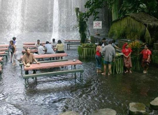 這間名為Villa Escudero的餐廳位于菲律賓呂宋島南部,除了擁有漂亮的風(fēng)景外,最特別之處在于餐廳位于一個(gè)瀑布之中,餐館中的桌子、凳子等均放在瀑布流經(jīng)的地方,因此人們?cè)谟貌偷倪^(guò)程中會(huì)一直感受到潺潺的流水從腳下經(jīng)過(guò),讓人有一種更加貼近大自然的感覺(jué)。在這里,游客們可以一面欣賞飛流直下的瀑布,一面品嘗風(fēng)味獨(dú)特的菲律賓美食,而且吃飽后還可以在瀑布下嬉戲一番。