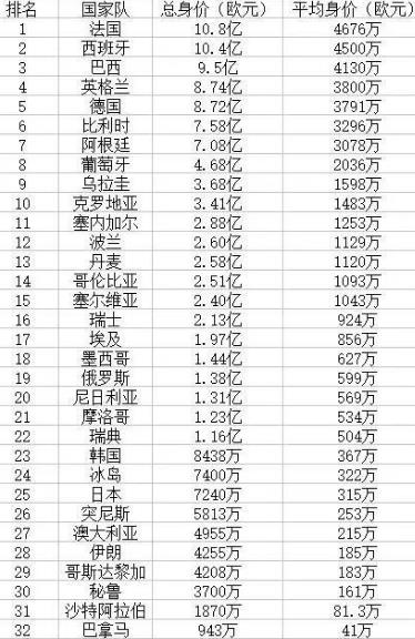 2018俄羅斯世界杯32強球隊身價排行榜公布了,根據德國權威足球網站《轉會市場》網站的統計,對參加2018俄羅斯世界杯的32強的球隊身價排行榜進行了統計,結果法國隊和西班牙隊的總身價都是超過了10億歐元,排名第一的是法國隊,他們的總身價高達10.8億歐元。西班牙緊隨其后,他們的總身價也突破了10億大關。法國隊和西班牙隊位居這份排行榜單的第一位和第二位,巴西隊則是位居第三位。