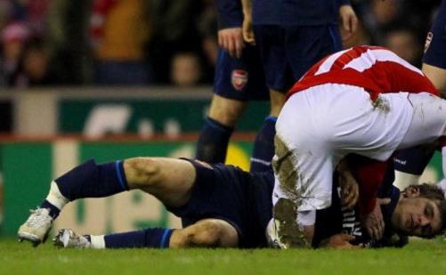 在死神拉姆塞遭受悲劇之前,槍手的另一位天才也曾遭遇同樣的慘劇。2008年2月23日,阿森納做客圣安德魯斯球場挑戰伯明翰。開場僅2分鐘,伯明翰中衛馬丁-泰勒飛鏟槍手前鋒愛德華多,導致后者小腿嚴重骨折。