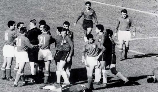1962年世界杯小組賽,意大利在第二場比賽中遭遇東道主智利隊。賽前一些意大利記者報道智利民不聊生、到處是貧民等,讓智利球迷大為不滿,加上意大利隊陣營中有很多南美移民,他們都被智利球迷視為南美叛徒,更加重了智利人的敵意。比賽一開始就充滿了粗野的犯規,后來更是成為了一場大混戰,意大利隊的費里尼僅8分鐘就被罰下,被警察扭送出場,隨后智利人桑切斯一記左鉤拳打斷意大利人馬斯奇奧的鼻梁,然后自己的腿被生生踢斷,沖突過程中,球員們甚至擺出了頗為職業的拳擊動作互相襲擊,比賽三次因為打斗而中斷。雖然東道主最終2比0獲勝,但是這場著名的“圣地亞哥之戰”卻成為了世界杯歷史上最丑陋的一幕。
