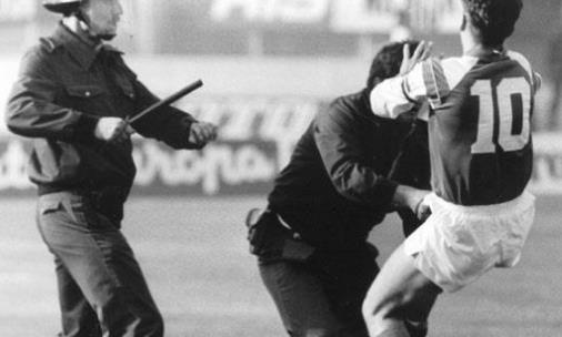 83到84賽季的西甲聯賽中,球王馬拉多納在巴塞羅那主場迎戰畢爾巴鄂競技隊的比賽中被對方的戈耶科切亞一次兇狠的鏟球導致右腿嚴重受傷,休戰了整整106天,結果當兩只球隊在這個賽季末的西班牙國王杯決賽中再度相遇的時候,馬拉多納成為了混亂的導火索。當畢爾巴鄂最終1比0獲勝之后,馬拉多納憤怒地踢倒了對方球員索薩以及畢爾巴鄂的球迷,雙方球員立刻加入了戰團,大打出手。騷亂瞬時間便引爆了整個球場,球迷們紛紛試圖越過鐵絲網,并與警察發生了激烈的沖突,結果數十人在混亂中受傷。值得一提的是,本場比賽的電視觀眾剛開始只有245萬人,但在打架瞬間,收視人數增加到325萬,成為那周西班牙收視冠軍。也正是在那場比賽之后,馬拉多納離開了西班牙,加盟了意大利的那不勒斯。