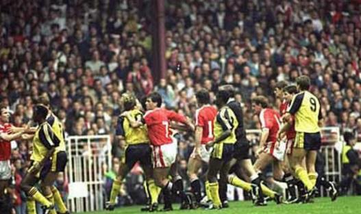 曼聯和阿森納這對老對頭幾乎每次見面都能碰撞出火花,03/04賽季第六輪,曼聯主場0比0戰平阿森納,范尼斯特魯伊在第80分鐘讓維埃拉吃到紅牌引起了阿森納球員的強烈不滿,在比賽的最后時刻罰失點球后,范尼遭到了以基翁為首的阿森納多名球員的圍攻,曼聯隊友也不甘示弱,引發了一場騷亂;不過兩支球隊最著名的一次群毆是1990年的英甲聯賽在老特拉福德上演的,亞當斯和麥克萊爾的口水戰導致雙方從場上到替補席上,甚至受傷的球員都參與了戰斗。最終阿森納被扣兩分,曼聯被扣一分,并且各被罰款五萬英鎊。