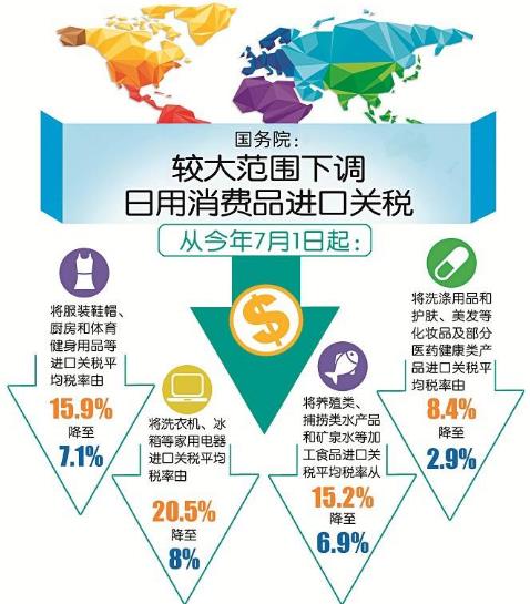 從今年7月1日起,將服裝鞋帽、廚房和體育健身用品等進口關稅平均稅率由15.9%降至7.1%;