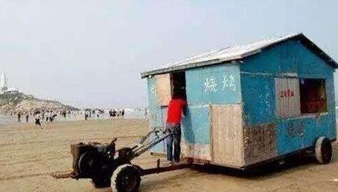 長樂漳港海灘有一輛多功能改裝車,遠(yuǎn)看就像一座立在海灘的小屋。小屋的造型很奇特,底下四個(gè)輪子儼然是拖拉機(jī)的構(gòu)造,車身是用木板搭起的藍(lán)色小屋。據(jù)附近居民介紹,這輛小房車常年停在這片海灘,車?yán)镌O(shè)備齊全,有賣各種游泳用品、零食,還能在里面燒烤,為了方便游人更換衣物,車主還特地在里面隔了間小更衣室,可謂設(shè)想周到。
