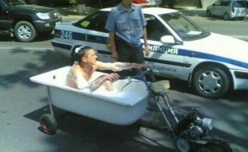這件事發(fā)生在俄羅斯,一個(gè)另類青年男子用改裝來的浴缸版摩托車公然在街道上一邊開車一邊洗澡,這種行為最終結(jié)果當(dāng)然會(huì)招來警察,幸好他還穿著一條底褲不然也會(huì)遭到曝光。