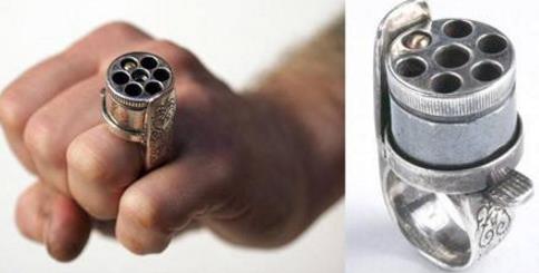 指環(huán)槍,一種戴在手指上的微型槍支,屬于個(gè)人自衛(wèi)武器,首創(chuàng)于19世紀(jì)的法國。使用指環(huán)槍需要手動(dòng)轉(zhuǎn)動(dòng)氣缸。槍體附有三個(gè)控制部件,最大的是側(cè)面的火錘,其次是氣缸發(fā)射鈕,最小的是觸發(fā)按鈕。通常可以將它戴在食指上,然后用拇指開槍。槍上沒有槍管,子彈由單造氣缸發(fā)射而出。
