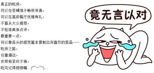 真正的吃貨,可以在蒼蠅館子暢快淋漓,可以在高級餐廳優雅有禮,不盲從大眾推薦,不輕信美食點評,最重要的一點,可以靠舌頭的感覺基本復制出你喜歡的菜品~~~吃貨之路,任重道遠,衣帶漸緊終不悔,吃完記得擦擦嘴~~~