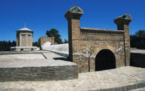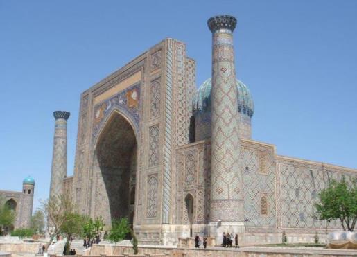 古爾-艾米爾陵墓位于撒馬爾罕,始建立于14世紀(jì),是帖木兒及其后嗣的陵墓,據(jù)說是帖木兒親自設(shè)計(jì)的,未經(jīng)任何改動(dòng)。整個(gè)陵墓造型壯觀,色彩鮮艷,有球錐形大圓頂,具有濃厚的東方建筑特色,是世界著名的中亞建筑瑰寶。古爾-艾米爾陵墓的主體是一個(gè)八角形的圓頂建筑,八角形的外體墻上有一段高約8米的鼓座,鼓座底部支撐著內(nèi)層穹頂。外表由密密的圓形對角菱線組成,通體包裹著天藍(lán)色琉璃面磚,色彩淡雅,光耀奪目。