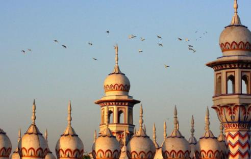 瓦齊爾•汗清真寺位于巴基斯坦古城拉合爾市,始建于公元1634年到1635年間,歷時7年才建造完成。清真寺建筑宏偉壯觀,是當地最著名的旅游景點之一,被稱為“拉合爾臉頰上的一顆美麗的痣”。這座清真寺不僅是游人喜歡的地方,也是鴿子最喜歡的地方之一:一片片鴿子從清真寺頂飛過,與清真寺相互映襯,完美體現了人文與自然的和諧統一。瓦齊爾•汗清真寺是一座由釉陶面磚建造而成的清真寺。