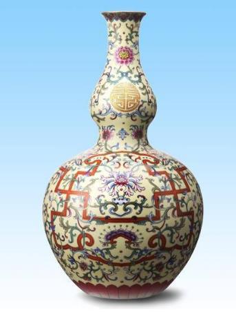 top4、清乾隆淺黃地洋彩錦上添花萬壽連延圖長頸葫蘆瓶