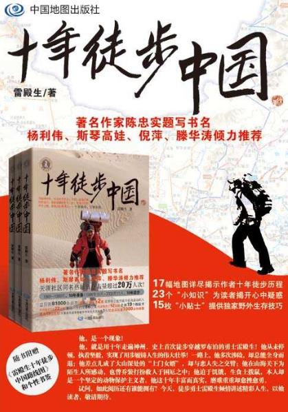 《十年徒步中國》是2012年中國地圖出版社出版的圖書,作者是雷殿生。該書記錄了作者十年走遍中國的風(fēng)雨路,并用地圖逐步揭示作者十年徒步歷程。他,獨自一人探秘神農(nóng)架;他,夜宿西藏阿里無人區(qū);他,路遇巨蟒驚險逃生,孤身戰(zhàn)群狼;他,生吞蛇肉只為充饑,喝血喝尿只為在茫茫戈壁求生……他是誰?他就是十年徒步走神州的“當(dāng)代徐霞客”,史上首次徒步穿越羅布泊的勇士,打破徒步行走世界記錄的雷殿生。《十年徒步中國》,詳細(xì)記錄了他十年來走遍神州大地的風(fēng)風(fēng)雨雨,是一部關(guān)于徒步旅行的優(yōu)秀文學(xué)作品。