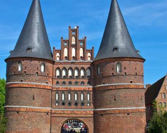 霍爾斯滕門坐落于石勒蘇益格-荷爾斯泰因州的呂貝克,是一個聞名德國的城門,為呂貝克的地標建筑。這個哥德式建筑為中世紀的防御工事,作為堡壘防御之用,為呂貝克唯一存留的城堡大門遺跡。霍爾斯滕門建造于1464—1478年,為現存中世紀晚期德國最著名的城門建筑,宏偉壯觀,令人稱奇,遠遠看去就像是一座紅色的小型城。城門由南北兩個塔樓和一個中央建筑構成,共有4層,墻壁厚達3.5米,在這樣的重壓下,整座建筑的地基已嚴重下陷,呈現出稍微傾斜的姿態。