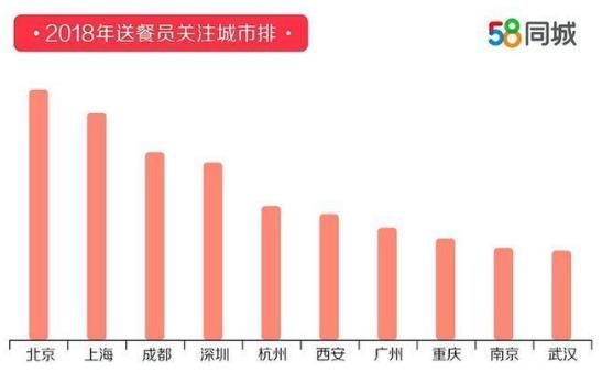 據58同城招聘研究院數據反映,2018年送餐員關注的前十大城市分別為北京、上海、成都、深圳、杭州、西安、廣州、重慶、南京、武漢,送餐員企業需求城市前十名分別為北京、上海、深圳、廣州、成都、重慶、南京、武漢、杭州、西安。送餐員關注的城市和對送餐員需求量最高的城市,都集中在一線和新一線,其中,一線城市的需求量更高,而美食之都成都也在兩大榜單上排名靠前。