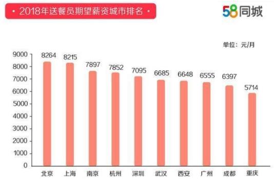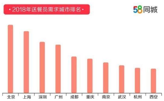 2019年1月21日,58同城發布《2018年送餐員就業報告》,對送餐員行業人群進行精準畫像,深度分析外賣市場行情、以及送餐員工作生活狀態。據58同城招聘研究院數據顯示,2018年全國送餐員平均薪資達7750元,從城市需求量看,送餐員需求量最高的城市為北京,其次是上海、深圳、廣州、成都。