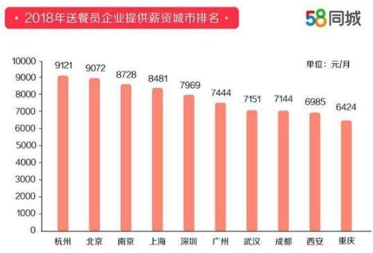 送餐員2018年平均薪資7750元,杭州以9121元排名第一