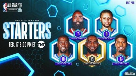 西部首發為:詹姆斯,杜蘭特,保羅-喬治(前場)庫里,哈登(后場)。