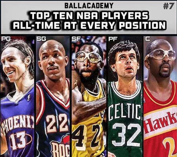 7、史蒂夫-納什、克萊德-德雷克斯勒、詹姆斯-沃西、凱文-麥克海爾、摩西-馬龍