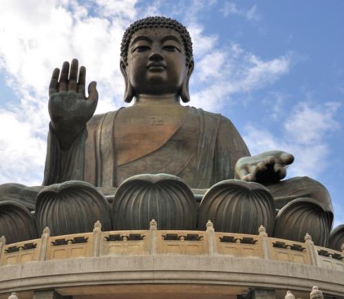 天壇大佛坐落在香港大嶼山木魚(yú)峰頂,是當(dāng)今世界上最大露天青銅坐像。佛像身高23米,連蓮花座及基座總高約34米。重250噸,由202塊青銅焊接而成。重5噸的佛面,在澆注時(shí)加入約2千克黃金,更添光彩。大佛造型集云崗、龍門(mén)佛像和唐代雕塑技術(shù)之精華,莊重慈祥。坐南朝北,右手齊胸屈舉,五根手指平伸,示“無(wú)畏印”,代表拔除痛苦;左手下垂腳上,反掌向外,指端微微向下,稱“與愿印”,寓意施予快樂(lè),表現(xiàn)了大雄大力與大慈大悲。被譽(yù)為尖端科技與東方藝術(shù)的結(jié)晶。從木魚(yú)山腳登上天壇底座,有260級(jí)石級(jí)。底座仿北京天壇圓丘而建,故名。內(nèi)部結(jié)構(gòu)分3層:功德堂、展覽廳和紀(jì)念堂。功德堂立有捐款者姓名的石碑。