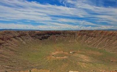 巴林杰隕石坑位于亞利桑那州的旗竿市以東40英里(約64.4公里)的地方,寬4000英尺(約1.22公里),深約600英尺(約183米)。該隕石坑還能保持圓形是因為它歷史相對較短(僅4萬年),以及它所處的北亞利桑那州沙漠的干燥氣候。據(jù)估算,這個隕石坑的“罪魁禍星”直徑大約為55碼(約50米),重約1.5萬噸。