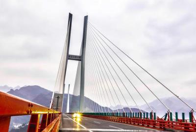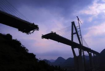 大橋于2005年10月26日開工建設,總投資約4.7億元,2008年7月完工。北盤江大橋位于貴州省關嶺縣與晴隆縣交界的北盤江大峽谷,主橋為單跨636米的簡支鋼桁梁懸索橋,全橋長964米,橋面寬28米,橋面至水面的高度為320米,項目總投資為4.3億元。北盤江大橋是我國目前已建成跨度最大的鋼桁梁懸索橋。