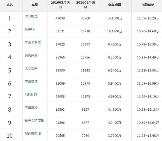 1、大眾朗逸,2、哈弗H6,3、豐田卡羅拉,4、別克英朗,5、大眾寶來,6、本田思域,7、現代ix35,8、豐田雷凌,9、日產全新藍鳥,10、現代菲斯塔。