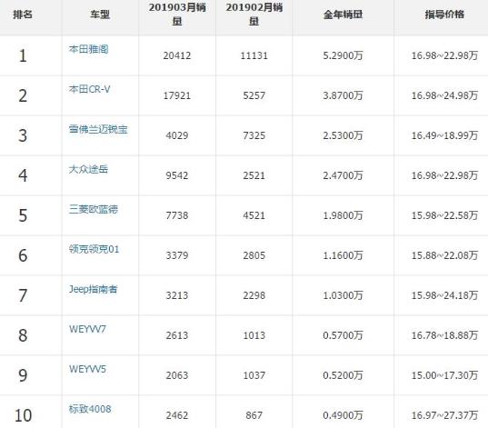 1、本田雅閣,2、本田CR-V,3、雪佛蘭邁銳寶,4、大眾途岳,5、三菱歐藍(lán)德,6、領(lǐng)克領(lǐng)克01,7、jeep指南者,8、WEYVV7,9、WEYVV5,10、標(biāo)致4008。