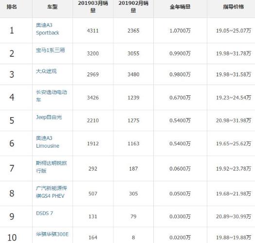 1、奧迪A3 Sportback,2、寶馬1系三廂,3、大眾途觀,4、長安逸動電動車,5、jeep自由光,6、奧迪A3 Limousine,7、斯柯達明銳旅行版,8、廣汽新能源傳祺GS4 PHEV,9、DSDS 7,10、華騏300E。