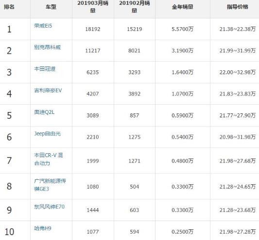 1、榮威Ei5,2、別克昂科威,3、本田冠道,4、吉利帝豪EV,5、奧迪Q2L,6、Jeep自由光,7、本田CR-V混合動(dòng)力,8、廣汽新能源傳祺GE3,9、東風(fēng)風(fēng)神E70,10、哈弗H9。