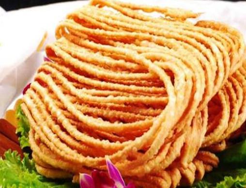 馓子,一種油炸食品,香脆精美。北方馓子以麥面為主料,南方馓子多以米面為主料。馓子色澤黃亮,層疊陳列,輕巧美觀,干吃香脆可口,泡過牛奶或豆漿后入口即化。