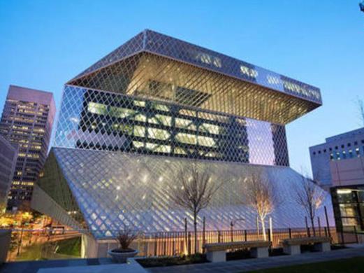 西雅圖中央圖書館是美國西雅圖公共圖書館系統的旗艦館。它位于市中心,是一幢由11層(56米高)的玻璃和鋼鐵組成的建筑。該館在2004年5月24日開放給公眾使用。圖書館由庫哈斯(Rem Koolhaas)設計,波特蘭的霍夫曼(Hoffman)建筑公司是總承包商。這個34000平方米的公共圖書館容納約145萬書籍和其他資料,其中包括超過400臺電腦向公眾開放,另設有一個地下公共停車場。頭1年的使用率超過 200萬人。圖書館有一個獨特和突出的外觀,構成若干分立“浮動平臺”,就像置身在一個大的蜘蛛網。