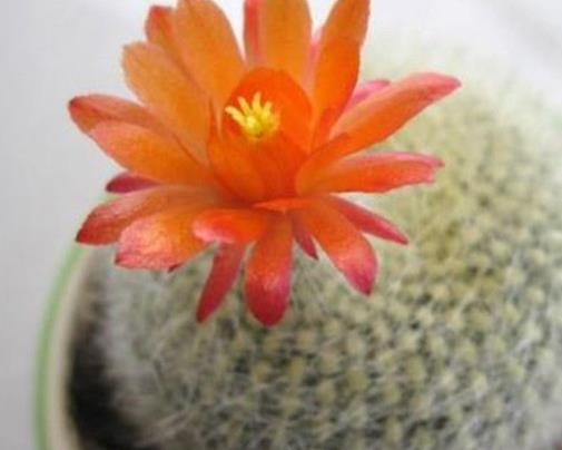 鸞鳳玉是仙人掌科星球屬多年生肉質草本植物,植株單生,呈球形至長球形,表面密布細小的白色絨毛,呈星點狀。通體具3-8條肥厚的肉質棱,棱直,棱脊呈三角狀,表皮密被白色叢卷毛。刺座著生于棱緣上,上有褐色短綿毛,無刺。春夏季開花,花生于莖頂,花色橙黃,呈漏斗狀,像菊花一樣。