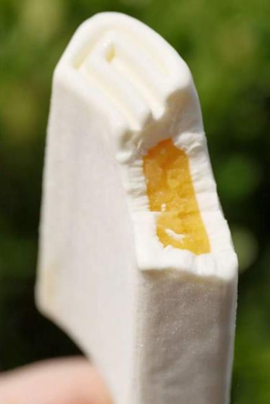 奧雪雙蛋黃冰淇淋這款雪糕就像它的名字一樣,中間做了兩個(gè)蛋黃的形狀,咸蛋黃的部分味道真的咸咸的,白色的區(qū)域則是濃郁的奶香味,兩種滋味在口中奇妙的融合在一起,感覺(jué)十分特別,是一款顏值與口感并存的雪糕。