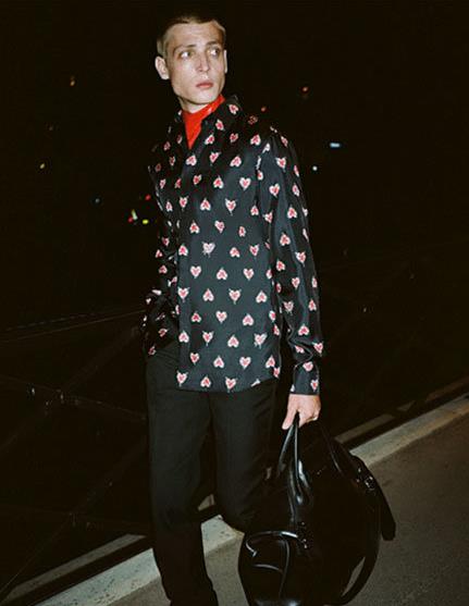路燈下的孤單男士,尋找戀人身影,一身黑色衣裝慵懶隨性,融入夜色,就像愛情悄然來臨他的身旁,平靜表象之下的每一句“LOVE”,都已化為愛心印花滿鋪衣裝,滿滿愛意一眼可見。