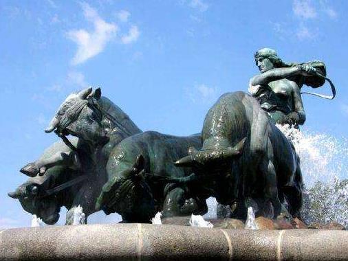 吉菲昂噴泉,位于哥本哈根市中心東北部。它由吉菲昂女神和四條牛及套犁等一組銅塑組成。吉菲昂女神左手扶犁,右手執(zhí)鞭,駕馭著四條銅牛拼力耕犁,四頭牛形態(tài)各異、栩栩如生,這里的突泉?dú)鈩?shì)磅礴,每一年都會(huì)吸引游客駐足觀看。
