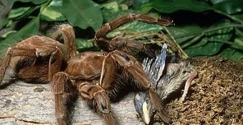 地棲蜘蛛, 雖然亞馬遜食鳥蛛和生活在亞馬遜雨林里的其他大型捕鳥蛛的外形非常嚇人,但是它們的攻擊性并不太強。即使它們咬了人,它們的尖牙(長達3.8厘米)刺穿了皮膚,這種蜘蛛也很少把毒液注入到受害者體內,相對而言,被捕鳥蛛咬傷的痛感較輕。對人類來說,亞馬遜食鳥蛛的尖牙并不是最主要的問題,被激怒的捕鳥蛛會抖落腹部的剛毛,這些毛毛很細,而且帶有倒鉤,它們進入人眼后,幾乎無法移除。