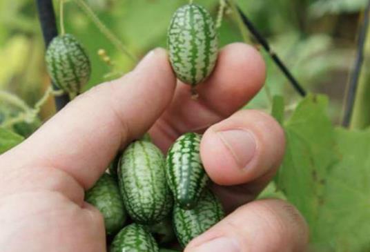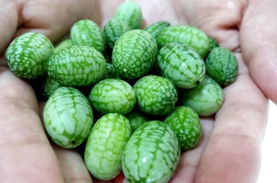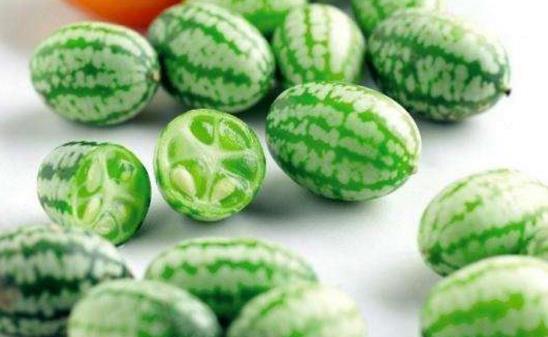 拇指西瓜也被稱之為佩普基諾,這種西瓜非常小,和一般圣女果一樣大。單看外形,這種西瓜就是普通西瓜的縮小版,但其實它的味道與西瓜相差很多。它的口感像黃瓜般爽脆,味道酸中帶甜,有點類似香蕉、酸橙的香味。非常的鮮美,是一種很不錯的水果。