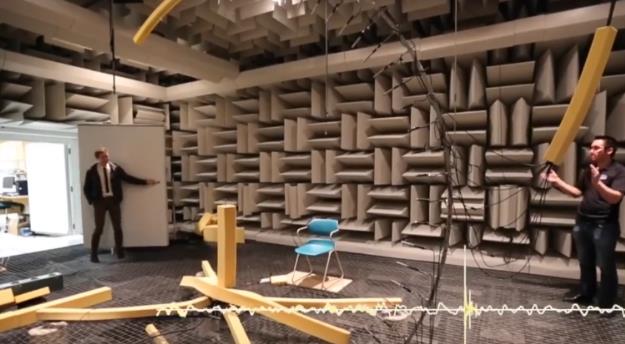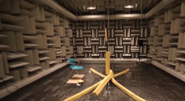 這間名為奧菲爾德的消音室能吸收99.99%的聲音,實(shí)驗(yàn)室四面由厚重的玻璃纖維隔音棉、雙層絕緣鋼墻,以及混凝土構(gòu)成,房間里安靜得讓人發(fā)慌。走進(jìn)去以后,人們只能聽到自己身體內(nèi)發(fā)出的聲音,比如心臟的跳動(dòng)聲、腸胃里食物正在消化的聲音,或者肚子餓了發(fā)出的響亮的“咕咕”聲。