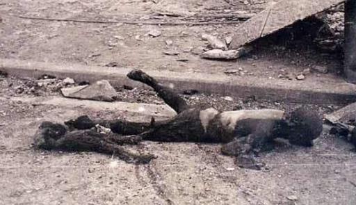 轟炸引發的大火幾乎將所有東西都點燃了,許多躲在防空洞里的人都被活活烤死,到處是亂竄的火苗,到處是恐怖的慘叫。逃跑的人們紛紛跳入附近的池塘和河流,但是大火的高溫將池塘里的水都煮開了。池塘成了開水鍋,水中避難的人都被滾燙的水活生生煮死。