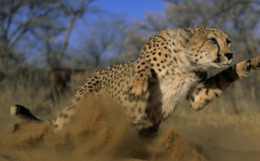 獵豹是陸地上奔跑得最快的動物,它的時速可以達到115公里,獵捕時速度最高可達120公里。不過雖然它的奔跑速度驚人,但是維持時間不長,因為高速的奔跑對它們整個身體的呼吸系統和循環系統都是一種考驗。當獵豹的奔跑速度達到115公里以上的時候,它的呼吸系統和循環系統都在超負荷運轉,身體會急速發熱,如果熱量不及時排出去,很容易虛脫至死,所以它們一般高速短跑幾百米后就會減速。