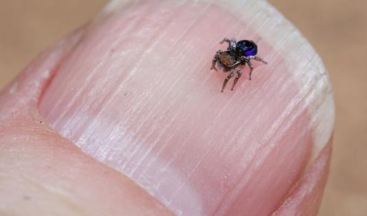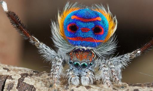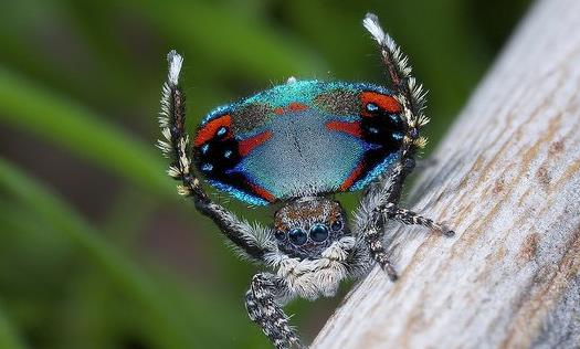 孔雀蜘蛛是跳蛛的一種,它們的體型非常小,大約只有5毫米大小。它會像孔雀一樣開屏,特性方面比較類似孔雀,也是雄性才有這漂亮的“屏”,而且只有求偶交配時期才會開屏。因為它很小肉眼很難細(xì)看開屏,需要借助放大工具才行。這些色彩主要集中在它的腹部,由紅、橙、藍(lán)、綠等鮮艷的顏色組成,其間還分布著一些條紋,形成了幾乎左右對稱的圖案,有的圖案甚至如同人的五官,十分奇特。